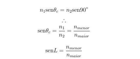Vimos no resumo que existe um ângulo crítico (ou um ângulo limite) para o qual um raio luminoso, que se propaga de um meio mais refringente para um meio menos refringente, sofre reflexão interna total de acordo com a equação: