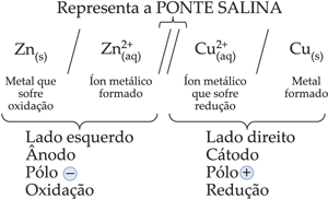 Para evitar que ocorra a mistura das soluções, utiliza-se a ponte salina, que une os dois compartimentos do eletrodo e completa o circuito elétrico. A ponte salina é formada por um gel contendo solução salina aquosa concentrada dentro de um tubo. A solução salina mais utilizada é o KCl, pois os íons K+ e Cl– não afetam as reações que ocorrem nas células.