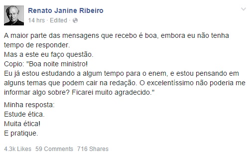 O Ministro da Educação é ministro, mas é um mero mortal: ele também tem conta no Facebook. E, como qualquer pessoa famosa, também tem uma caixa de entrada com inúmeras mensagens da galera que quer manter uma relação com ele: desde aquele cara que pede um like no seu último vídeo sobre Minecraft no Youtube até pessoas que perguntam qual será o tema da redação do Enem 2015.