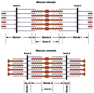 As unidades de actina e miosina que se repetem ao longo da miofibrila são chamadas, sarcômeros. As faixas mais externas dos sarcômeros, claras, são denominadas de banda I e contêm apenas filamentos de actina. A faixa central mais escura é denominada banda A. As extremidades da banda A são formadas por filamentos de actina e miosina sobrepostos, enquanto a sua região mediana mais clara, denominada banda H, contém apenas miosina.