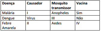 Assinale a alternativa que preenche, correta e respectivamente, as lacunas I, II, III e IV da tabela acima.