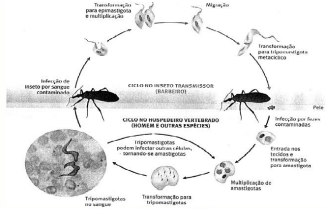 III) o protzoário pode ser epimastigota, tripomastigota ou amastigota, as quais designam a sua forma. A tripomastigota tem forma em formato de C e é flagelada. A epimastigota possui forma flagelada encontrada apenas no vetor, com capacidade reprodutiva. Por fim a amastigota é a aforma intracelular, sem flagelo, encontrada no hospedeiro vertebrado com capacidade reprodutiva.2.