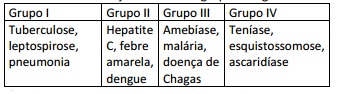 As doenças retratadas nos quadros são classificadas da seguinte maneira: tuberculose, leptospirose e pneumonia são causadas por bactérias; hepatite C, febre amarela, e dengue são causadas por vírus; amebíase, malária e doença de chagas são causadas por protozoários; teníase, ascaridíase e esquistossomose são causadas por vermes (platelmintos e nematelmintos). A única opção que possui a seguinte correspondência “Grupo I- bactérias, Grupo II- vírus, Grupo III- protozoários e Grupo IV- vermes” é a opção D.