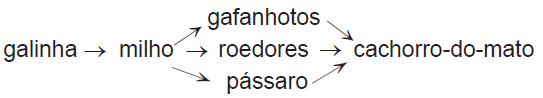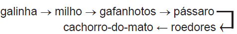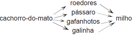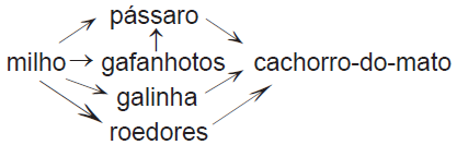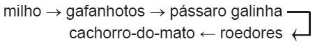 2. (ENEM) Um agricultor, que possui uma plantação de milho e uma criação de galinhas, passou a ter sérios problemas com os cachorros-do-mato que atacavam sua criação. O agricultor, ajudado pelos vizinhos, exterminou os cachorros-do-mato da região. Passado pouco tempo, houve um grande aumento no número de pássaros e roedores que passaram a atacar as lavouras. Nova campanha de extermínio e, logo depois da destruição dos pássaros e roedores, uma grande praga de gafanhotos destruiu totalmente a plantação de milho e as galinhas ficaram sem alimento. Analisando o caso anterior, podemos perceber que houve desequilíbrio na teia alimentar representada por: