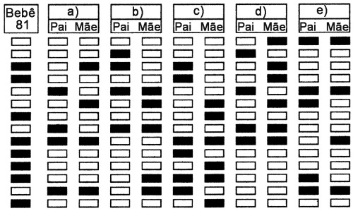 Algumas regiões do DNA são sequências curtas de bases nitrogenadas que se repetem no genoma, e o número de repetições dessas regiões varia entre as pessoas. Existem procedimentos que permitem visualizar essa variabilidade, revelando padrões de fragmentos de DNA que são “uma impressão digital molecular”. Não existem duas pessoas com o mesmo padrão de fragmentos com exceção dos gêmeos monozigóticos. Metade dos fragmentos de DNA de uma pessoa é herdada de sua mãe e metade, de seu pai. Com base nos padrões de fragmentos de DNA representados a seguir, qual dos casais pode ser considerado como pais biológicos do Bebê 81?