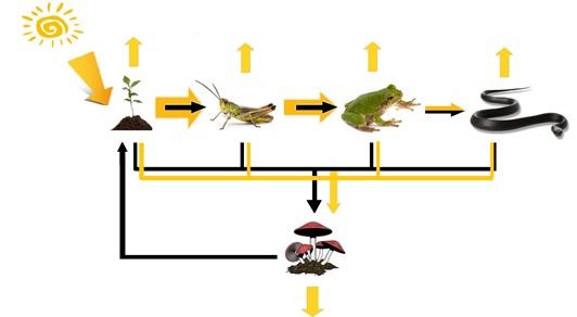 As setas em preto indicam a transferência de matéria orgânica, enquanto as setas amarelas indicam a energia que é transferida e perdida. Repare que o tamanho das setas amarelas diminui conforme passam os níveis tróficos, representando que a energia transferida diminui ao longo da cadeia