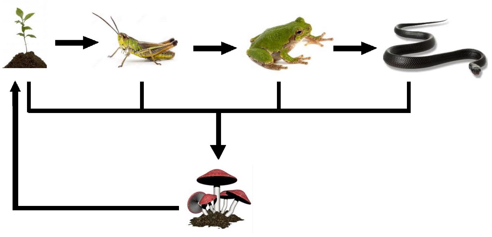 A imagem mostra uma teia alimentar, nomeando seus componentes. Repare que as setas indicam o fluxo de matéria orgânica, e todos são decompostos pelos decompositores