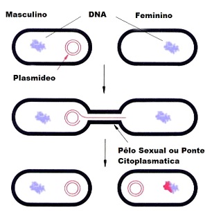 Como assim? A resistência oferecida pela bactéria pode ocorrer de duas maneiras: através das mutações em seu DNA ativo e via transferência de DNA resistente entre bactérias diferentes. Os genes de resistência quase sempre fazem parte dos filamentos de DNA circulares extracromossômicos (plasmídeos) que podem ser transferidos entre organismos via conjugação, como exemplificado no esquema abaixo: