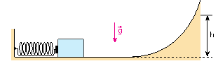 O bloco (massa de 4,0kg), inicialmente em repouso, comprime a mola ideal (constante elástica de 3,6.103 N/m) de 20cm, estando apenas encostado nela. Largando-se a mola, esta distende-se impulsionando o bloco, que atinge a altura máxima h. Adotando g=10m/s2, determine: