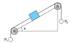 2. Um bloco de 10kg repousa sozinho sobre o plano inclinado a seguir. Esse bloco se desloca para cima, quando se suspende em P2 um corpo de massa superior a 13,2kg. Retirando-se o corpo de P2, a maior massa que poderemos suspender em P1 para que o bloco continue em repouso, supondo os fios e as polias ideais, deverá ser de:
