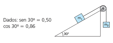 2. Na figura m1=100kg, m2=76kg, a roldana é ideal e o coeficiente de atrito entre o bloco de massa m1 e o plano inclinado é μ=0,3.
