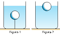 4. Uma esfera de isopor de volume 2,0.10²cm³ encontra-se inicialmente em equilíbrio presa a um fio inextensível, totalmente imersa na água (figura 1). Cortando-se o fio, a esfera aflora, passando a flutuar na superfície da água (figura 2).