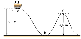 3. Numa montanha-russa, um carrinho com 300kg de massa é abandonado do repouso de um ponto A, que está a 5,0 m de altura. Supondo que os atritos sejam desprezíveis e que g = 10 m/s², calcule: