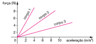 1. A figura abaixo mostra a força em função da aceleração para três diferentes corpos 1, 2 e 3. Sobre esses corpos é correto afirmar:
