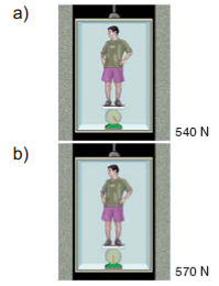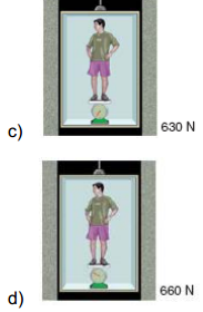 2. Uma balança na portaria de um prédio indica que o peso de Chiquinho é de 600 newtons. A seguir, outra pesagem é feita na mesma balança, no interior de um elevador, que sobe com aceleração de sentido contrário ao da aceleração da gravidade e módulo a=g/10, em que g=10m/s2. Nessa nova situação, o ponteiro da balança aponta para o valor que está indicado corretamente na seguinte figura:
