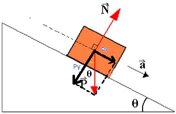 Pensando Horizontalmente (em x), vemos que só há forças puxando o bloco plano a baixo. Logo, a soma das forças será igual a F=m.a.