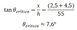 Como isso é uma estimativa, vamos supor que a torre seja homogênea, logo o centro de gravidade está na metade da altura (h = 55 m), a uma distância x’ = x/2 = 2,25 m em relação à vertical, por semelhança de triângulos. A condição para que a torre esteja na iminência de tombar é que a linha imaginária vertical que passa pelo centro de gravidade esteja na borda de sua base circular, ou seja, x’ = r, onde r é o raio da base = 3,5m. Assim, x’ deve aumentar 3,5 – 2,25 = 1,25 m e x deve aumentar 2,5 m, já que seu valor inicial era de 4,5 m. Finalmente, a torre alcançaria um ângulo crítico dado por