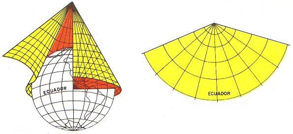 Este tipo de projeção coloca a Terra dentro de um cone (sim!), os paralelos do planeta viram circulos concentricos – uma das deformidades – e os meridianos viram retas que se encontram em um ponto especial (dai o cone). A grande deformidade se dá conforme se distancia do paralelo mais próximo do ponto que “fecha” o cone. Vejam só!
