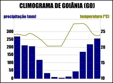 Este tipo de clima está presente na maior parte do território brasileiro, estendendo-se pela parte central do país. É caracterizado por apresentar o inverno e o verão bem definidos por seus índices pluviométricos, respectivamente baixo e elevado. Sendo assim, no climograma, o clima Tropical é apresentado com barras elevadas nos meses de inverno e baixas nos meses de verão. Quando à temperatura, esta não sofre grandes variações, ficando em torno de 18° a 28°. Um exemplo deste clima é a cidade de Goiânia, no estado de Goiás.