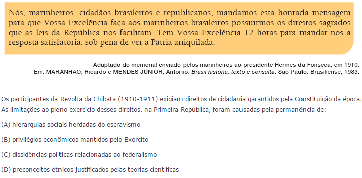Liderada por João Cândido, o Almirante Negro, a Revolta da Chibata foi um movimento de marinheiros contra os castigos físicos ainda existentes na Marinha Brasileira, como um resquício do período escravista. Lembremos que essa revolta aconteceu em 1910, apenas vinte e dois anos após a abolição da escravidão no Brasil. Na primeira fase da UERJ de 2010 foram cobradas exatamente as causas da Revolta da Chibata e sua relação com o período escravista.