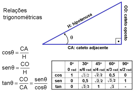 Ou deseja-se saber a altura de um avião ou a distância que ele percorreu. Dependendo dos dados do problema e do pedido, podemos encontrá-lo utilizando a tangente, o seno ou o cosseno de um ângulo do triângulo formado pela altura do avião, pelo seu deslocamento horizontal e pela hipotenusa, que, nesse caso, representa a ligação entre o ponto do solo e o avião após seu deslocamento.