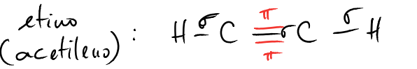 Na molécula de etino (H-C≡C-H) existem duas ligações π e uma σ: