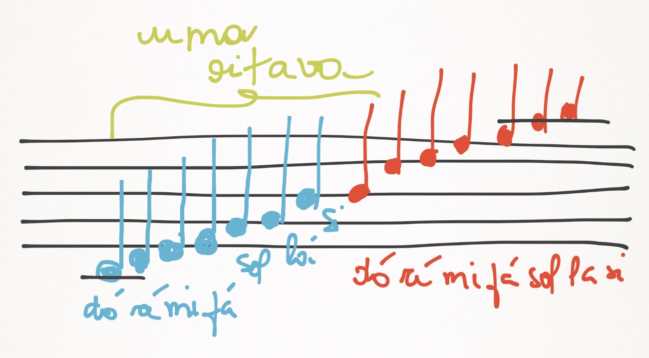 Pois é, e cada uma das notas iguais são separados pelo dobro da frequência da outra. Ou seja, vão ser “mais rápidos” do que o outro, e o de maior frequência sempre vai ser mais agudo.