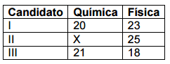 1. Ao final de uma competição de ciências em uma escola, restaram apenas três candidatos. De acordo com as regras, o vencedor será o candidato que obtiver a maior média ponderada entre as notas das provas finais nas disciplinas química e física, considerando, respectivamente, os pesos 4 e 6 para elas. As notas são sempre números inteiros. Por questões médicas, o candidato II ainda não fez a prova final de química. No dia em que sua avaliação for aplicada, as notas dos outros dois candidatos, em ambas as disciplinas, já terão sido divulgadas.