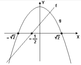 3. Sabe-se que o polinômio P(x) = -2x³ – x² + 4x + 2 pode ser decomposto na forma P(x) = (2x + 1) . (-x² + 2). Representando as funções reais f(x) = 2x + 1 e g(x) = -x² + 2, num mesmo sistema de coordenadas cartesianas, obtém-se o gráfico a seguir: