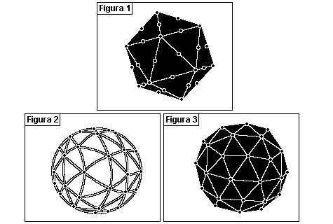 Admita que o icosaedro é inflado até que todos os pontos marcados fiquem sobre a superfície de uma esfera, e os lados dos triângulos tornem-se arcos de circunferências, como ilustrado na figura 2. Observe agora que, substituindo-se esses arcos por segmentos de reta, obtém-se uma nova estrutura poliédrica de faces triangulares, denominada geodésica. (Fig. 3)