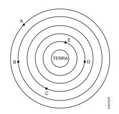 O esquema representa as trajetórias circulares de cinco satélites, de mesma massa, orbitando a Terra.