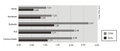3. (Uerj) Observe no gráfico o número de médicos ativos registrados no Conselho Federal de Medicina (CFM) e o número de médicos atuantes no Sistema Único de Saúde (SUS), para cada mil habitantes, nas cinco regiões do Brasil.