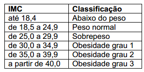 4. (Fuvest) O Índice de Massa Corporal (IMC) é o número obtido pela divisão da massa de um indivíduo adulto, em quilogramas, pelo quadrado da altura, medida em metros. É uma referência adotada pela Organização Mundial de Saúde para classificar um indivíduo adulto, com relação ao seu peso e altura, conforme a tabela a seguir.