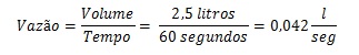 Vamos pegar, então, uma garrafa peti de 2,5 litros. Enchendo-a com a mangueira, calculamos que demorou 1 minuto para que ela fique totalmente cheia. A vazão, portanto, é: