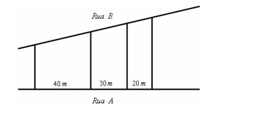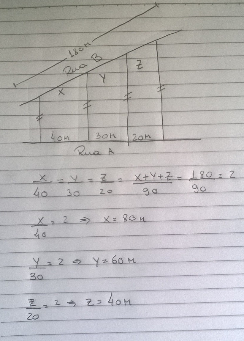 1. (Fuvest-SP) Três terrenos têm frente para a rua A e para a rua B, como na figura. As divisas laterais são perpendiculares à rua A. Qual a medida de frente para a rua B de cada lote, sabendo que a frente total para essa rua tem 180m?