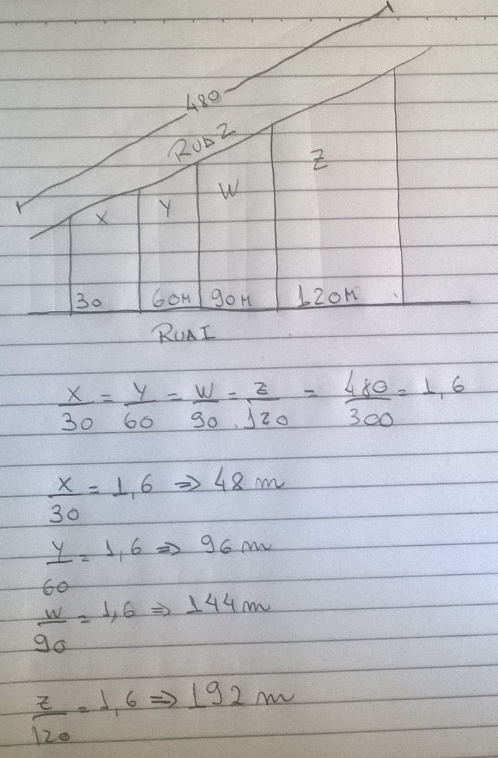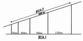 2. (UFMA) Uma determinada firma imobiliária resolveu lotear um terreno em 4 outros menores com duas frentes: uma para a rua 1 e outra para a rua 2, como mostra a figura abaixo. Sabendo-se que as divisões laterais são perpendiculares à rua 1 e que a frente total para a rua 2 é de 480 m, qual a medida da frente de cada lote, para a rua 2, respectivamente?