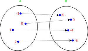 A definição de funções é dada pelo estudo de dois conjuntos A e B não vazios, onde existe uma função f de A em B, dada por uma relação que associa a cada elemento x ∈ A um único elemento y ∈ B. Ou seja, se temos dois conjuntos A e B, estabelecemos uma relação de função de A em B, quando para cada elemento de A estiver relacionado apenas um elemento de B. Ao conjunto de partida, damos o nome de Domínio (Dom(f)) da função; ao conjunto de chegada, damos o nome de Contra-Domínio (CD(f)) da função; e o conjunto dos elementos relacionados a cada elemento de A é chamado de Imagem (Im(f)) da função.