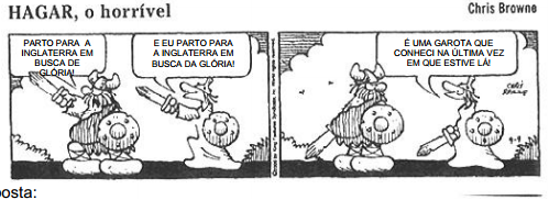 1. O jogo linguístico presente é percebido no uso do artigo que acompanha a preposição. No primeiro quadrinho, na fala de Hagar, a expressão “em busca de glória” passa o valor semântico de vitórias, conquistas. Já na fala do amigo de Hagar, que diz “em busca da Glória”, a preposição ‘de’ ligada ao artigo feminino ‘a’ apresentam a ideia de buscar uma pessoa, no caso, a Glória. No segundo quadrinho, percebe-se que tal entendimento é correto, já que o personagem explica a situação anterior.