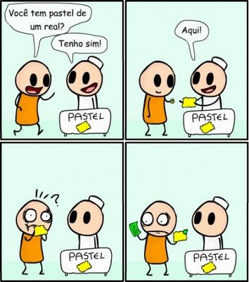 A ambiguidade na tirinha acima ocorre por conta da preposição de, em “pastel de…”. A ideia semântica da preposição é indicar o material com o qual é feito o pastel, como em “pastel de carne” ou “pastel de queijo”. Ao receber o pastel com o recheio de uma nota de um Real, foge-se ao campo semântico. Não é o que se espera, por isso, dizemos que o vendedor compreendeu de forma ambígua o pedido do cliente.