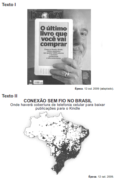 A capa da revista Época de 12 de outubro de 2009 traz um anúncio sobre o lançamento do livro digital no Brasil. Já o texto II traz informações referentes à abrangência de acessibilidade das tecnologias de comunicação e informação nas diferentes regiões do país. A partir da leitura dos dois textos, infere-se que o advento do livro digital no Brasil