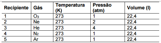 3. A tabela abaixo apresenta informações sobre cinco gases contidos em recipientes separados e selados.