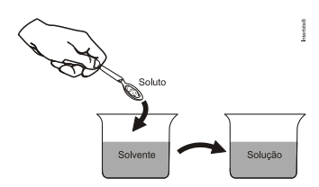 1. Ao colocar um pouco de açúcar na água e mexer até a obtenção de uma só fase, prepara-se uma solução. O mesmo acontece ao se adicionar um pouquinho de sal à água e misturar bem. Uma substância capaz de dissolver o soluto é denominada solvente; por exemplo, a água é um solvente para o açúcar, para o sal e para várias outras substâncias. A figura a seguir ilustra essa citação.