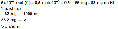 O volume da solução preparada que cada pessoa deve beber para ingerir a dose diária prescrita de iodeto de potássio corresponde, em mililitros, a: (Dados: K = 39; I = 127)