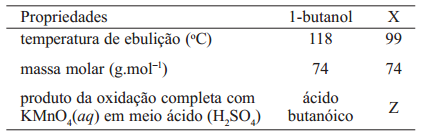 a) Forneça o tipo de isomeria que ocorre entre 1-butanol e o composto X. Dê a fórmula estrutural do composto Z.