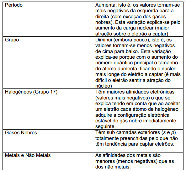 A Eletronegatividade de um átomo (E) tem um valor tanto maior quanto maior for a sua energia de ionização (I) e quanto maior for a sua afinidade eletrônica (mais negativa) (A.E.)