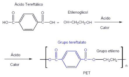 3. (UDESC) O poli(tereftalato deetileno), PET, é um termoplástico muito utilizado em garrafas de refrigerantes. Esse composto pode ser obtido pela reação química representada pela equação: