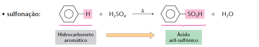 A Sulfonação é a substituição pelo grupo SO3H, oriundo da reação com o ácido sulfúrico.