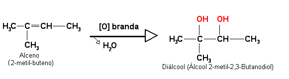 Diferentemente da reação de substituição, em que ocorre a substituição de átomos de hidrogênio por grupos funcionais, na oxidação, os carbonos insaturados da cadeia carbônica tem seu número de oxidação (Nox) aumentado. Isto ocorre porque, na oxidação, há uma quebra dessa ligação dupla entre carbonos e uma adição de um grupo funcional em cada carbono.