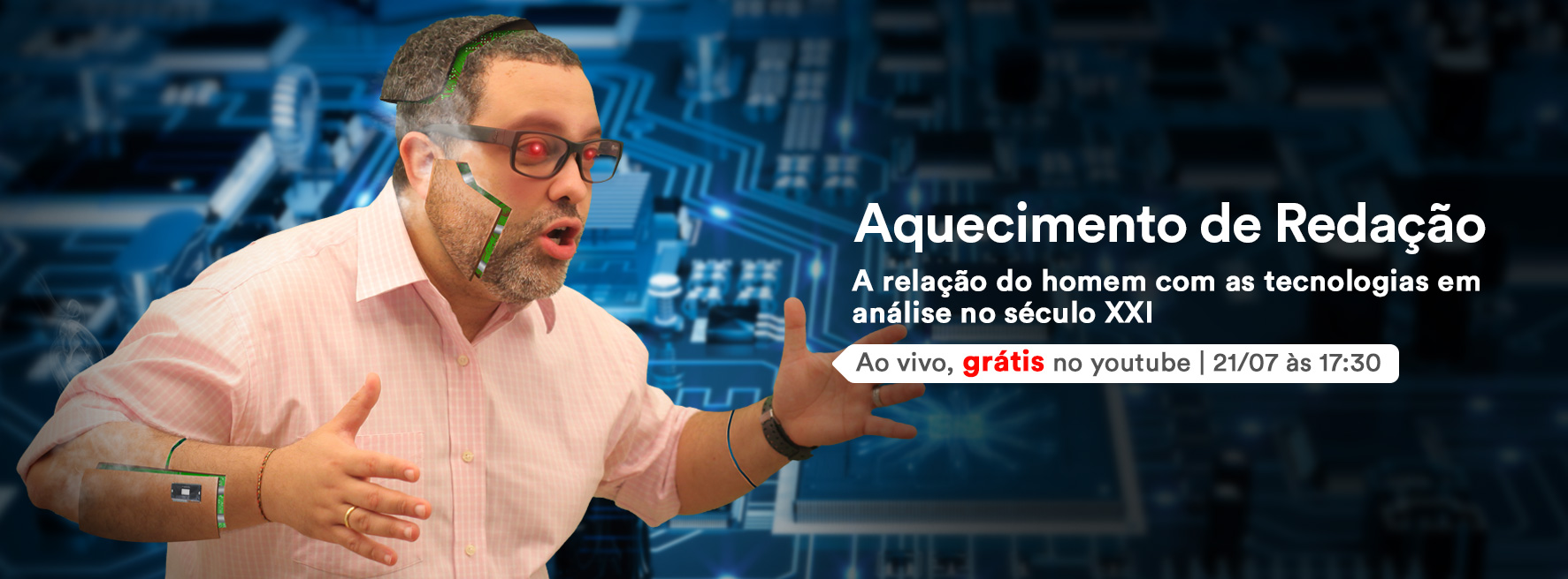 Você sabia que toda terça-feira, às 17h30, nós temos um Aquecimento de Redação grátis? Na última terça, discutimos a relação do homem com a tecnologia. Todas as nossas aulas ficam gravadas lá em www.youtube.com/Descomplica!