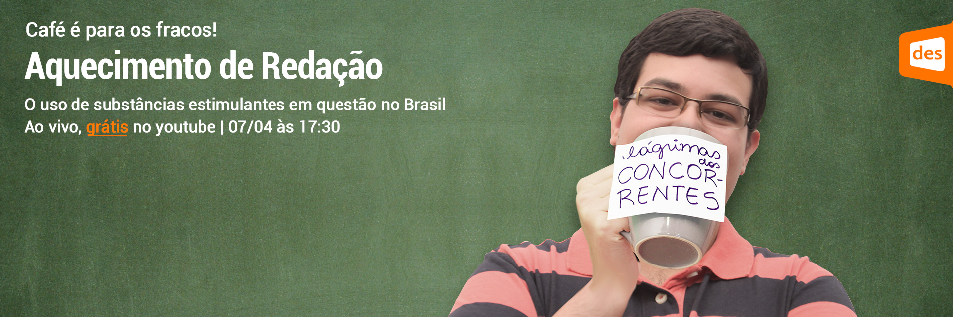 Toda terça-feira, às 17h30, nossos professores e monitores vão discutir o tema de redação postado aqui no blog e te ajudar a construir o melhor texto do vestibular sobre o tema! Vai ficar de fora? Nesta terça, discutiremos o tema Os efeitos do uso de substâncias estimulantes no século XXI. Confira, abaixo, a proposta de redação, e se prepare para o Aquecimento de Redação! Terça-feira, 7 de abril, às 17h30! ![]()